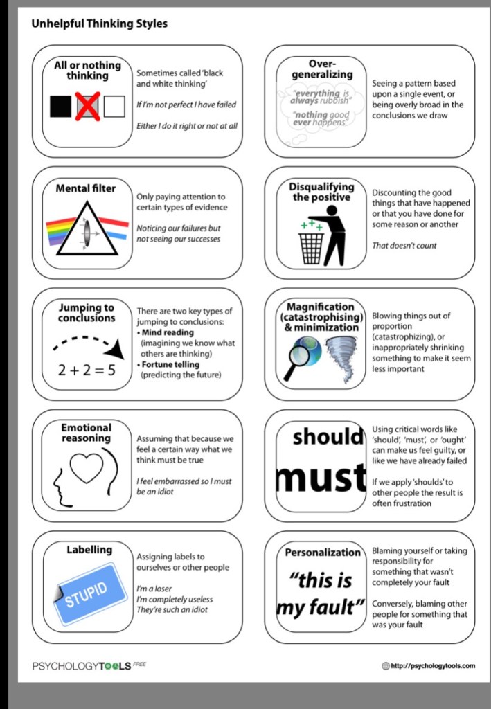 These are the things I’ve been busy doing. It’s a busy some people won’t understand and that’s okay. I’m learning to follow the guidance of my soul and listen to spirit. It hasn’t been easy to dump your goals off to the side and feel the loss of control during this journey of healing but it’s necessary. Necessary to take time off and figure out if my goals are what I truly wanted or were they a product of society’s programming. In that process I kinda had to go through a grieving process of letting go of who I used to be while shedding/and unlearning what I thought was absolute. This is a time of heavy shadow work. Working to get to the root of your emotions. Ultimately all this work brought me back to my true life purpose to be the light worker I am meant to be, to inspire others to reinvent themselves and their environment. What were you meant to do? What does your soul call for? What unhealthy thinking styles do you have? Save this chart to help you decipher what’s going on in your life.